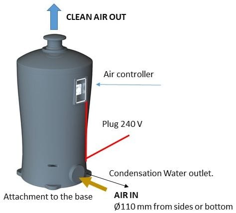 The unit includes a fan, an airflow regulator, a carbon replacement sleeve, and activated carbon selected according to the specific requirements of the site.